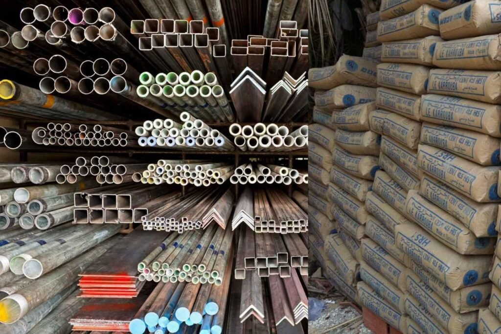 Stacks of quality cement bags and steel rods ready for construction projects across Lusaka.